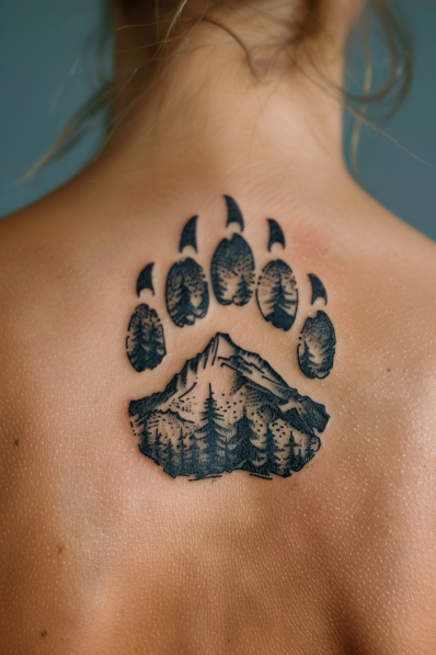 This unique tattoo features a bear paw print filled with a beautifully detailed mountain landscape. The clever design incorporates pine trees and rugged peaks within the paw s negative space, creating a perfect blend of strength and natural beauty. The intricate linework and shading bring the scene to life, making it feel like a window into the wilderness. It s bold yet artistic, seamlessly combining two iconic symbols of the wild.