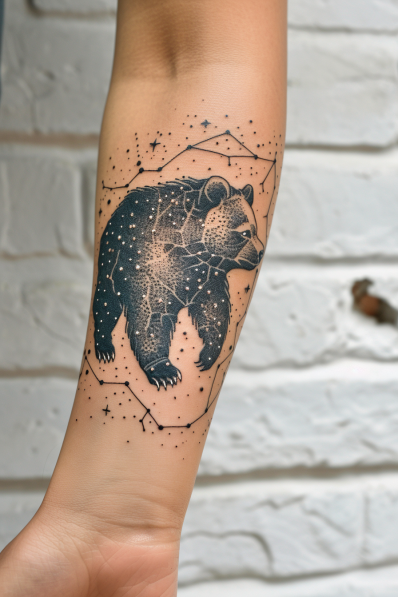 I m absolutely blown away by the creativity in this design. The blend of the bear s strength with the mystique of the stars is nothing short of mesmerizing. It s like wearing a piece of the universe while channeling the bear s power and wisdom. The geometric accents make it contemporary and edgy, while the starry details add a touch of magic. This tattoo is perfect for anyone who loves astronomy, wildlife, or just wants a tattoo that feels otherworldly. It s a conversation starter and a piece of art all in one!