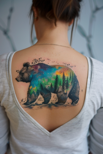 What I find particularly cool about this tattoo is how it feels both personal and expressive. The mix of bold colors and the bear s serene demeanor suggests inner strength paired with a creative, free-spirited personality. It s a tattoo that tells a story possibly of resilience, individuality, or a deep connection to nature. Plus, placing it on the back allows for a larger canvas, making it a true statement piece. If you love art and want to showcase your wild side, this tattoo does the job with flair!