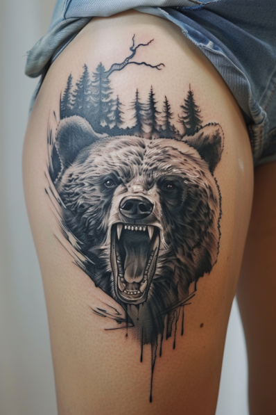 Roaring Bear with Forest Backdrop Thigh Tattoo