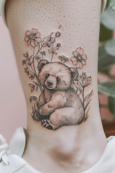 Playful Bear Cub with Wildflowers Ankle Tattoo
