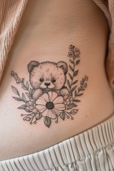 Cute Baby Bear with Floral Arrangement Side Tattoo