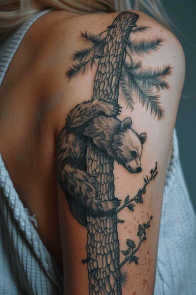 This captivating arm tattoo showcases a curious bear climbing a tall pine tree, with incredible attention to detail in the bear s fur and the tree s bark. The branches stretch outward, adding a natural flow to the design, while small buds and leaves bring a touch of life to the piece. The shading is soft and precise, creating a sense of depth that makes the bear look as though it s mid-climb. The vertical placement on the arm fits perfectly, accentuating the natural lines of the body.