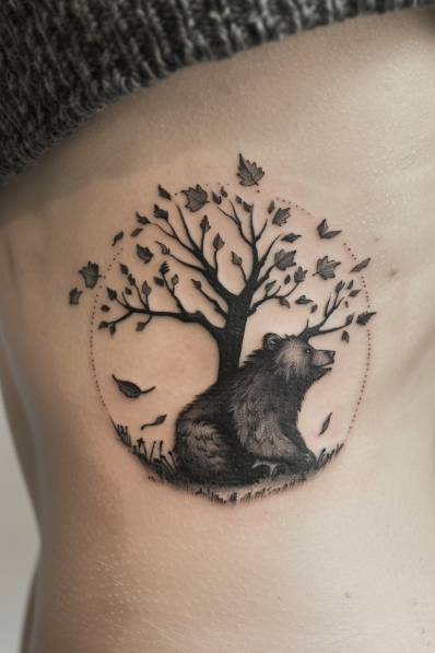 I love how this tattoo captures a sense of calm and grounding. The bear symbolizes strength and introspection, while the tree and falling leaves evoke a connection to growth and the changing seasons. It s beautifully detailed yet minimal enough to remain timeless. This design is perfect for anyone looking for something that feels both meaningful and visually stunning a quiet tribute to the beauty of nature and resilience.