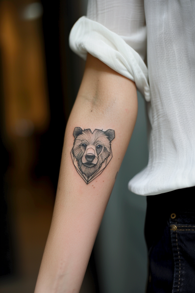 This sleek forearm tattoo showcases a minimalist bear design framed within a subtle geometric outline. The bear s face is depicted with clean, fine lines that highlight its natural features without overwhelming the overall composition. The geometric frame, a simple inverted triangle, adds a modern touch, creating symmetry and balance to the piece. Its placement on the forearm makes it effortlessly visible, perfect for someone who wants a tattoo that s understated but still packed with personality.