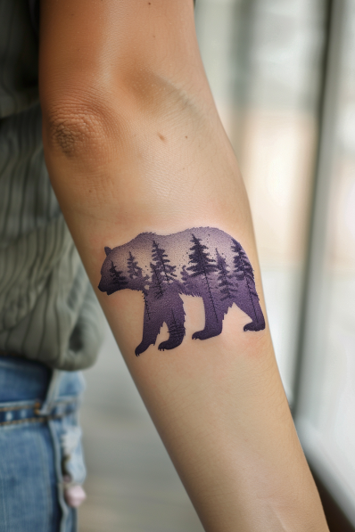 This stunning tattoo combines the bold outline of a bear with a serene forest scene inside its silhouette. The design is brought to life with gradient shading in rich purples and subtle pinks, giving it a dreamy, twilight-like atmosphere. The trees within the bear create a seamless connection to nature, and the clean lines keep the overall look modern and sleek.