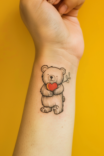 This adorable tattoo features a charming little bear standing upright, holding a bright red heart in its paws. The bear s simple linework and soft shading give it a sweet, cartoon-like appearance, while the vibrant heart adds a bold pop of color. A small branch tucked behind the bear adds a subtle touch of whimsy and nature-inspired charm. The overall design is playful and heartwarming, perfect for anyone who loves lighthearted tattoos with a bit of personality.