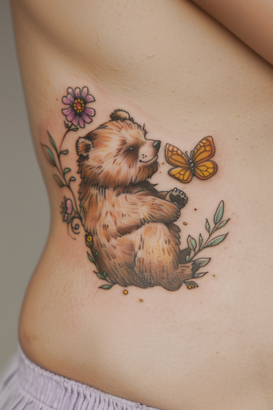 This adorable side tattoo features a sweet bear cub sitting comfortably among delicate flowers and leafy branches, playfully reaching out toward a vibrant orange butterfly. The cub s fur is shaded in soft, warm tones, giving it a cuddly and lifelike appearance. The bright pops of color from the butterfly and flowers add a cheerful and whimsical touch, while the curved composition flows naturally with the side placement, creating a balanced and harmonious design.