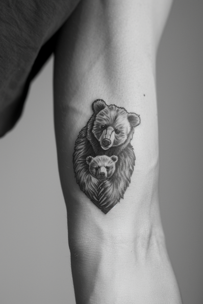 This heartwarming forearm tattoo portrays a mother bear and her cub, beautifully nestled together in a way that exudes warmth and protection. The shading is masterfully done, creating a soft, textured fur effect that brings the duo to life. The composition is vertical, which makes it ideal for the forearm, and the way the cub snuggles close to the mother bear perfectly captures the bond between parent and child. It s a simple design, but the emotional resonance behind it is undeniable.