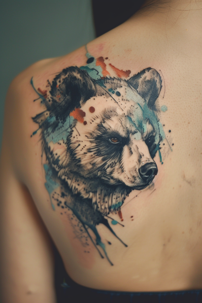 This back tattoo presents a beautifully stylized bear portrait, blending realism with artistic flair. The bear s expression is calm yet focused, with its fur rendered in precise black and gray tones. Surrounding the bear are vibrant watercolor splashes in teal, burnt orange, and crimson hues, giving the design a playful yet sophisticated edge. The drips and splatters create a sense of movement, as if the bear is emerging from a painter s canvas, bridging the gap between nature and art. The balance between clean, sharp lines and abstract colors makes this piece captivating from every angle.