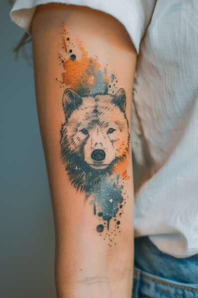 This mesmerizing arm tattoo features a bear s face surrounded by an explosion of watercolor splashes in fiery orange and deep blue hues, creating a cosmic, almost galactic vibe. The bear itself is drawn with fine, realistic detail, its calm and wise expression contrasting beautifully with the abstract background. The combination of bold colors and soft shading gives the piece an ethereal energy, like the bear is part of the universe itself. The placement on the arm ensures it s always visible, making it a wearable piece of art.