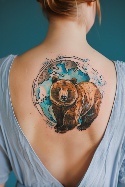 This stunning tattoo features a realistic brown bear standing proudly against a watercolor-style globe backdrop. The bear s detailed fur contrasts beautifully with the abstract splashes of blue, green, and white that represent the earth, creating a perfect harmony between nature and art. The circular composition frames the bear, making it the focal point while the globe adds depth and symbolism. The soft watercolor effect gives the design a dreamy, ethereal vibe.