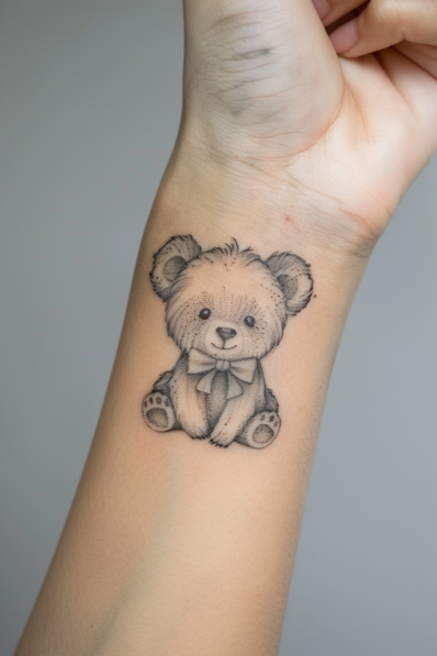 This charming wrist tattoo features an adorable teddy bear sitting sweetly with a tiny bow around its neck. The delicate linework and soft shading bring out the bear s plush, cuddly appearance, making it feel almost huggable. Its small size fits perfectly on the wrist, creating a subtle yet irresistibly cute piece of ink. The simplicity of the design adds to its timeless appeal, making it a classic choice for anyone who loves a touch of nostalgia.