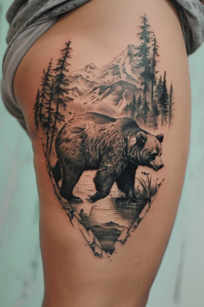 This breathtaking thigh tattoo depicts a majestic bear in its natural habitat, walking gracefully near a reflective body of water. Behind the bear, towering pine trees and rugged mountains set the stage for a serene wilderness scene. The shading is impeccable, with fine details in the bear s fur and the textured forest, giving the entire piece a lifelike, almost photographic quality. The triangular frame subtly contains the design, focusing attention on the bear while adding a modern touch.