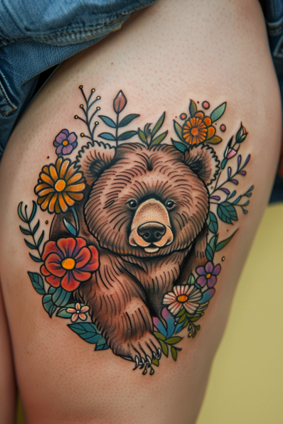 This vibrant thigh tattoo features an adorable bear surrounded by a lush bouquet of colorful flowers. The bear s expression is soft and inviting, with fur that s rich in shading, giving it a lifelike warmth. The flowers, in shades of red, orange, yellow, and purple, bring a lively and cheerful vibe to the design. The bold outlines and bright colors make it pop, creating a perfect balance between the natural and the whimsical. The placement on the thigh allows for a larger canvas, letting every detail shine beautifully.