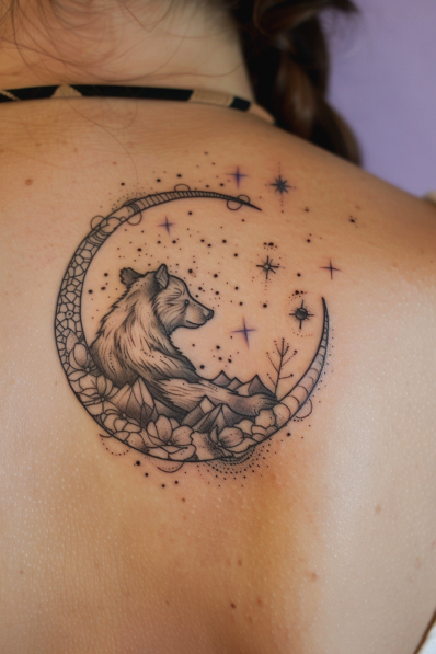 I absolutely adore how this tattoo combines strength and tranquility in such a creative way. The bear, a symbol of resilience, paired with the moon and stars, adds a touch of mystery and wonder. It s like the tattoo quietly whispers, You re part of something bigger. If you re the kind of person who s drawn to night skies and nature s power, this design checks all the boxes. Plus, the placement on the back gives it a subtle yet elegant vibe like a hidden piece of art only revealed when you want it to be.