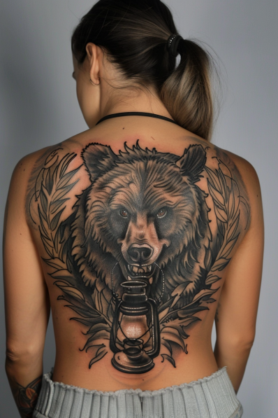 This bold and captivating tattoo features the face of a fierce bear clutching a lantern in its mouth, framed by elegant laurel leaves. The bear s intense gaze and detailed fur make it the centerpiece of this powerful design. The lantern, rendered with intricate shading, adds a vintage touch while symbolizing guidance and illumination. The surrounding laurel leaves balance the composition, lending a sense of triumph and achievement to the overall piece.