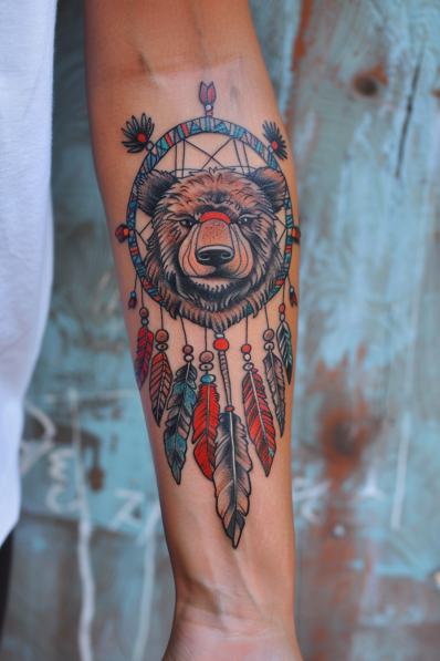 Bear in Dreamcatcher Tattoo with Bold Colors
