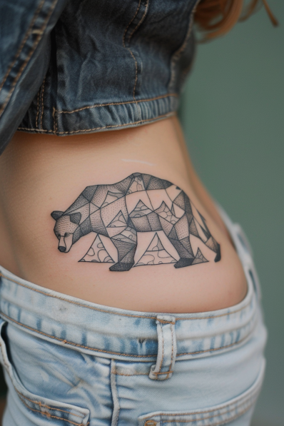 What I love about this tattoo is how it s both minimalistic and packed with symbolism. The geometric style feels trendy without being overly flashy, and the hidden mountains within the bear are like a secret nod to your adventurous spirit. Plus, the hip placement adds a cool factor it s like a piece of art you carry just for yourself (and anyone lucky enough to catch a glimpse). If you re into modern designs with a touch of the wild, this one checks all the boxes.