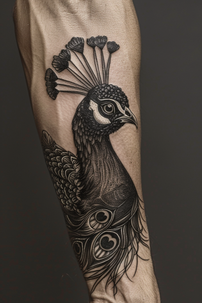 This bold blackwork tattoo features the proud profile of a peacock intricately detailed along the forearm. The design is all about contrast and depth, with the peacock s feathers rendered in a striking combination of sharp lines and dense dot shading. The bird s crest and eyes are particularly detailed, giving it a lifelike intensity, while the tail feathers curve around the arm, incorporating traditional ornamental patterns that add a timeless feel. The black and gray palette keeps the focus on the texture and form, making this tattoo both visually striking and elegantly understated.
