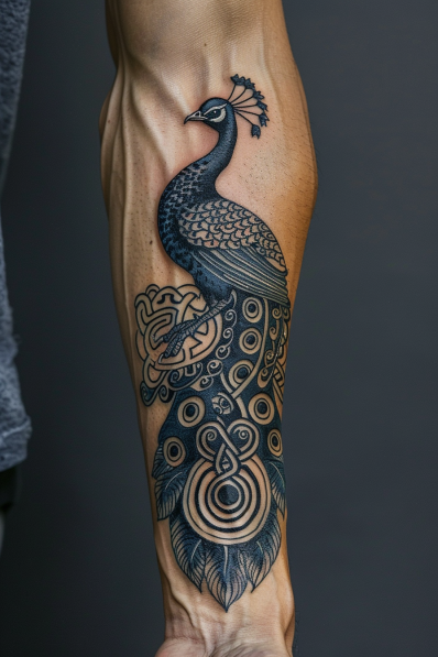 I have to say, this tattoo is truly impressive! The blend of the peacock s natural beauty with the intricate, symbolic Celtic knotwork is a brilliant combination. It s like merging two powerful symbols beauty and immortality with the deep meaning behind the Celtic knots, which often represent eternity and interconnectedness. The placement on the forearm is perfect, allowing the detailed work to be fully appreciated. If you re someone who loves tattoos with rich symbolism and detailed artistry, this peacock with Celtic knotwork is an outstanding choice. It s a piece that not only looks stunning but also carries a deep and personal significance.