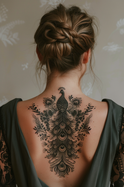 I m seriously impressed by this back tattoo! The symmetry and detail in the design are just out of this world it s like a perfect blend of art and elegance. The way the peacock s feathers are intertwined with floral patterns gives it a sophisticated, almost regal feel. And can we talk about the placement? Covering the upper back like that really makes it stand out, and it s the kind of tattoo that demands attention (in the best way possible). If you re looking for a tattoo that s both bold and beautifully detailed, this one definitely ticks all the boxes. It s the kind of ink that s bound to make people do a double-take!