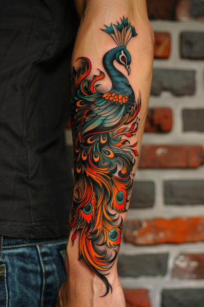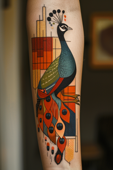 This striking forearm tattoo features a peacock rendered in a bold, Art Deco-inspired style. The design is a blend of geometric shapes and vibrant colors, with the peacock s feathers depicted in rich oranges, reds, and greens. The bird stands tall against a background of abstract, linear patterns that echo the elegance and sophistication of the Art Deco movement. The use of sharp lines and contrasting colors gives the tattoo a modern, edgy feel, while still paying homage to the classic beauty of the peacock.