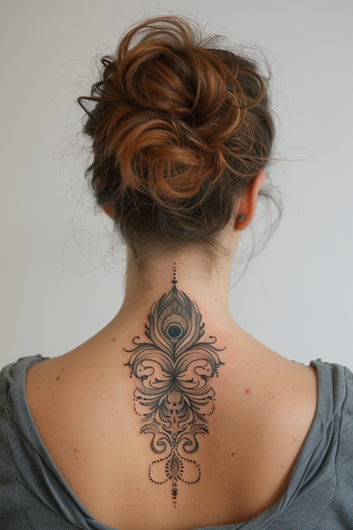 This elegant tattoo features a beautifully stylized peacock feather design, perfectly centered on the nape of the neck and extending down the upper back. The intricate linework and dotwork give the tattoo a delicate, almost lace-like appearance. The feather s eye is prominently placed at the top, surrounded by ornamental swirls that flow gracefully downward, creating a sophisticated and symmetrical pattern. The design is minimalist yet ornate, making it a perfect choice for someone who appreciates subtle elegance with a touch of flair.