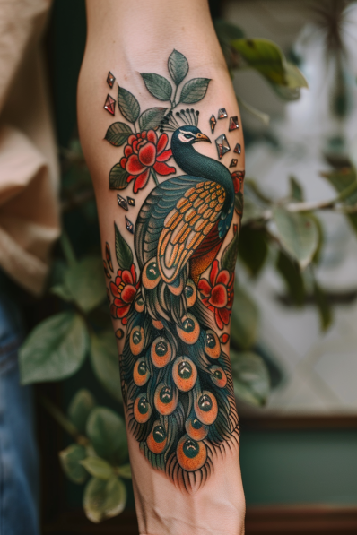 This enchanting tattoo features a regal peacock perched gracefully on the forearm, surrounded by vibrant red flowers and adorned with mystical crystal accents. The peacock s feathers are detailed with rich greens, blues, and oranges, creating a vivid contrast against the bold red of the flowers. The addition of sparkling crystals scattered around the peacock adds a magical, otherworldly touch, making the design feel both elegant and mystical. The tattoo s composition is perfectly balanced, with the peacock s tail feathers cascading down the arm, drawing the eye naturally through the design.