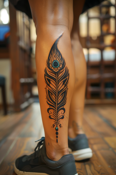 This striking tattoo features a bold peacock feather with a tribal-inspired design, elegantly placed on the back of the leg. The tattoo is a perfect blend of traditional and contemporary styles, with the peacock feather s iconic eye at the center, surrounded by intricate tribal patterns that extend down the calf. The black ink gives the design a sharp, clean look, while the symmetrical elements add balance and flow to the piece. The placement on the leg allows the design to elongate naturally, making it a visually captivating tattoo that stands out with every step.