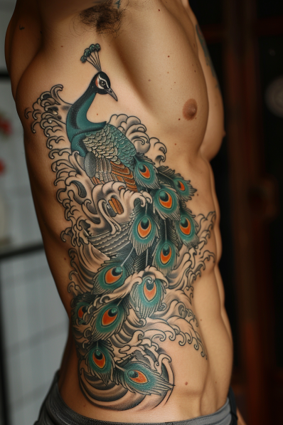 I ve got to say, this tattoo is seriously cool! The way it merges the natural beauty of a peacock with abstract geometry is just genius. It s like a piece of modern art that you can carry with you wherever you go. The colors are vibrant without being too flashy, and the placement on the side of the torso is perfect it s bold but also easy to hide if needed. If you re someone who loves unique, contemporary designs that stand out, this peacock tattoo with its geometric flair is definitely a winner. It s the kind of tattoo that s sure to spark conversations and admiration!