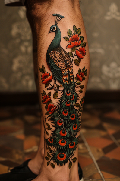 I ve got to say, this leg tattoo is a real head-turner! The traditional style gives it that classic tattoo vibe, but the use of color really makes it pop. I love how the peacock s tail feathers flow down the leg, almost like they re growing right out of the skin. And those red flowers? They re the perfect contrast, adding a touch of warmth and depth to the overall design. If you re looking for a tattoo that s both bold and beautiful, this one is definitely worth considering. It s the kind of piece that stands out in a crowd, and I m all about that!