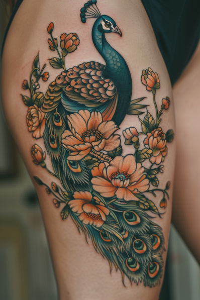 I m absolutely in love with this tattoo! The combination of the peacock and flowers is just so lush and luxurious, it s like carrying a piece of fine art on your skin. The colors are vibrant without being overwhelming, and the way the design flows with the natural curves of the thigh is simply stunning. It s the kind of tattoo that makes a statement, yet still feels feminine and elegant. If you re into bold, beautiful designs that turn heads, this peacock thigh tattoo is definitely a winner. Plus, it s perfect for anyone who wants to showcase their love for nature in the most stylish way possible!