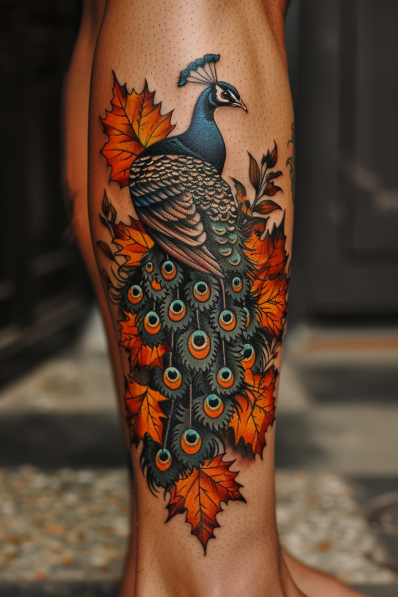 This stunning tattoo features a regal peacock surrounded by vibrant autumn leaves, creating a beautiful contrast between the cool tones of the bird and the warm hues of the season. The peacock s feathers are detailed with deep blues and greens, highlighted by the iconic eye patterns, while the fiery orange and red leaves add a rich, seasonal backdrop. The placement on the leg allows the design to flow naturally, with the peacock s elegant tail feathers cascading down, intertwined with the falling leaves, giving the tattoo a dynamic and harmonious feel.