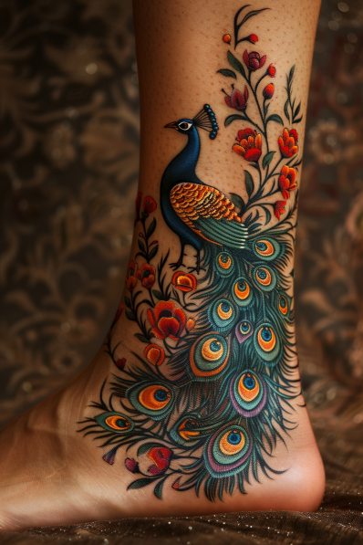 This tattoo is a stunning display of a peacock perched elegantly along the ankle, with its vibrant feathers cascading down onto the foot. The design is rich in detail, featuring the peacock s brilliant blue and green plumage adorned with the iconic eye patterns in shades of orange and gold. The surrounding floral elements in warm reds and oranges add a lovely contrast, creating a harmonious blend of nature-inspired beauty. The placement on the ankle and foot is not only unique but also allows the peacock s tail feathers to flow naturally, giving this piece a dynamic and graceful look.