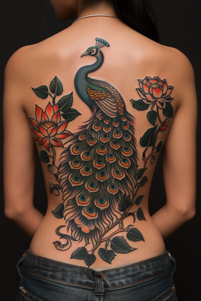 This stunning full-back tattoo showcases a regal peacock with its tail feathers cascading down the spine, surrounded by vibrant lotus flowers. The peacock s feathers are meticulously detailed, with rich blues, greens, and hints of gold that give the design a lifelike quality. The lotus flowers on either side add a burst of color, with their bold orange and red petals providing a beautiful contrast to the cooler tones of the peacock. The overall design is symmetrical and balanced, making excellent use of the entire back as a canvas.