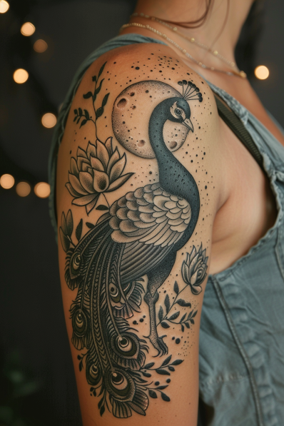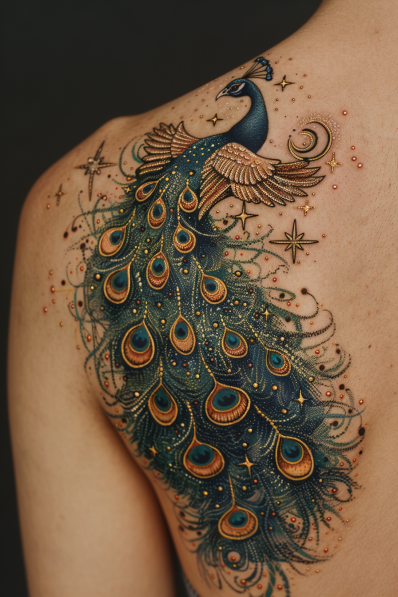 I ve got to say, this tattoo is just out of this world literally! The celestial theme adds such a unique twist to the classic peacock design, and I love how the gold accents make the whole piece pop against the darker blues and greens. It s like the peacock is not just a bird, but a guardian of the stars, and that s pretty cool if you ask me. The placement on the shoulder and upper back is perfect, giving the design space to shine while also allowing the details to flow naturally with the body s contours. If you re into tattoos that are both elegant and a little bit mystical, this one definitely hits the mark. It s the kind of piece that s sure to leave people starstruck!