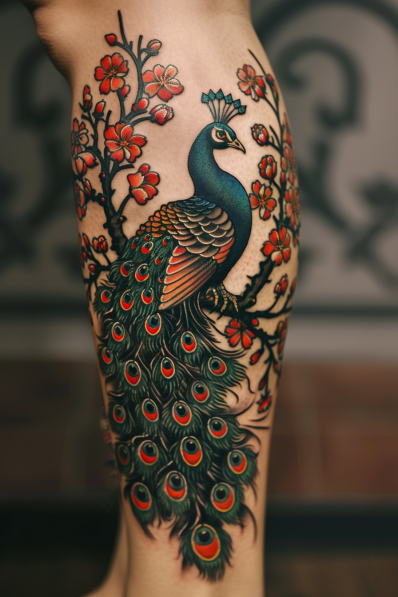 I have to say, this tattoo is simply stunning! The combination of the peacock and cherry blossoms creates a perfect balance of boldness and delicacy. I love how the peacock s vibrant colors stand out against the softer tones of the cherry blossoms, creating a beautiful contrast that s visually striking. The way the design wraps around the leg gives it a sense of movement and fluidity, making it feel like a living piece of art. If you re looking for a tattoo that s both elegant and eye-catching, this one definitely hits the mark. It s a gorgeous blend of nature s beauty, all captured in a single, breathtaking design!