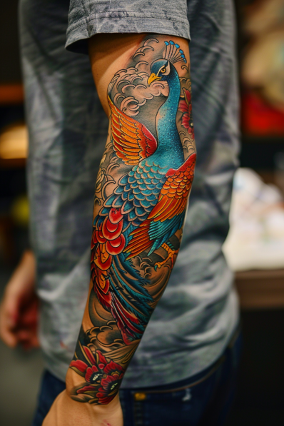 This vibrant tattoo takes a Japanese-style approach to the classic peacock, creating a stunning full sleeve design that commands attention. The peacock is brought to life with rich blues, fiery reds, and golden yellows, giving the feathers an intense, almost fiery glow. The surrounding elements, such as the swirling clouds and vibrant flowers, add depth and movement to the piece, making the peacock appear as though it s soaring across the arm. The intricate detailing in each feather and the bold, traditional Japanese lines make this tattoo a perfect blend of elegance and intensity.