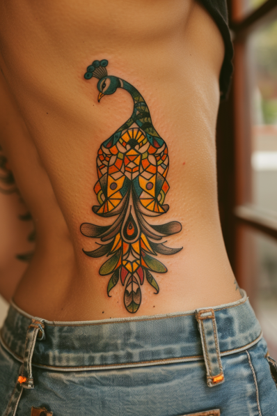 This eye-catching tattoo features a peacock rendered in an abstract geometric style, placed perfectly along the side of the torso. The design combines the elegance of a peacock with the boldness of geometric shapes, creating a unique and modern twist on a classic motif. The peacock s feathers are stylized with clean lines and vibrant colors, including shades of orange, yellow, green, and blue, giving the tattoo a stained-glass window effect. The symmetry and balance of the geometric patterns add structure to the design, while the organic shape of the peacock brings a sense of flow and movement.