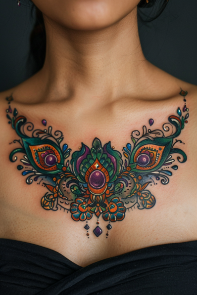 This stunning tattoo, spread elegantly across the upper chest, draws inspiration from the vibrant beauty of peacock feathers, combined with an ornamental design that s rich in color and detail. The central focus is a large, intricate peacock feather with swirling lines and vibrant jewel tones of purple, green, and orange. The feather is flanked by additional ornate elements that mimic the eye spots found on peacock feathers, creating a symmetrical and harmonious look. The design is further enhanced with small gems and delicate accents that give it a regal, almost jewelry-like appearance.