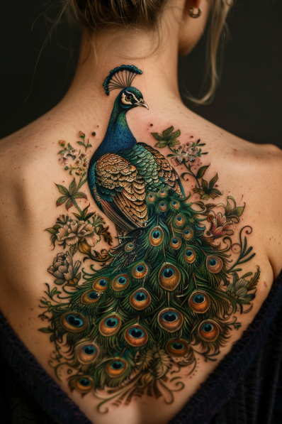Honestly, this tattoo is nothing short of breathtaking! The combination of bold colors and intricate details makes it a real showstopper. I love how the peacock is the focal point, but the surrounding flowers add a nice balance, giving the whole piece a sense of harmony. Plus, the back placement is perfect for such a detailed design it gives the tattoo room to breathe and ensures that every little detail can be appreciated. If you re someone who wants a tattoo that s both striking and full of personality, this peacock back piece is definitely the way to go. It s the kind of tattoo that will turn heads for all the right reasons!