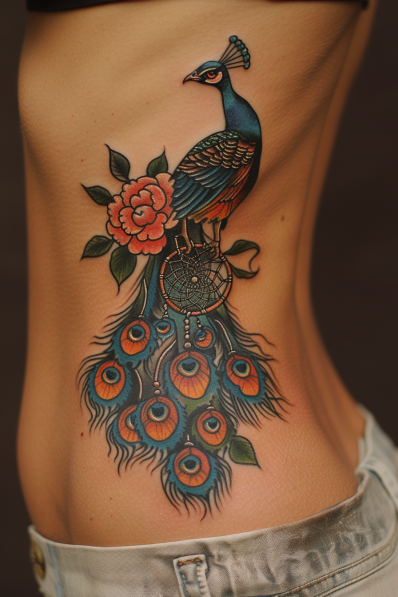 This unique and enchanting tattoo features a peacock perched elegantly on the side of the body, with its stunning tail feathers intertwined with a dreamcatcher. The design is rich in symbolism, blending the beauty and grace of the peacock with the protective qualities of the dreamcatcher. The peacock s feathers are vibrantly colored in shades of blue, green, and orange, flowing down gracefully while the dreamcatcher, detailed with delicate threads and beads, adds a mystical element to the overall design. A beautiful rose accents the top, adding a touch of softness to the bold imagery.