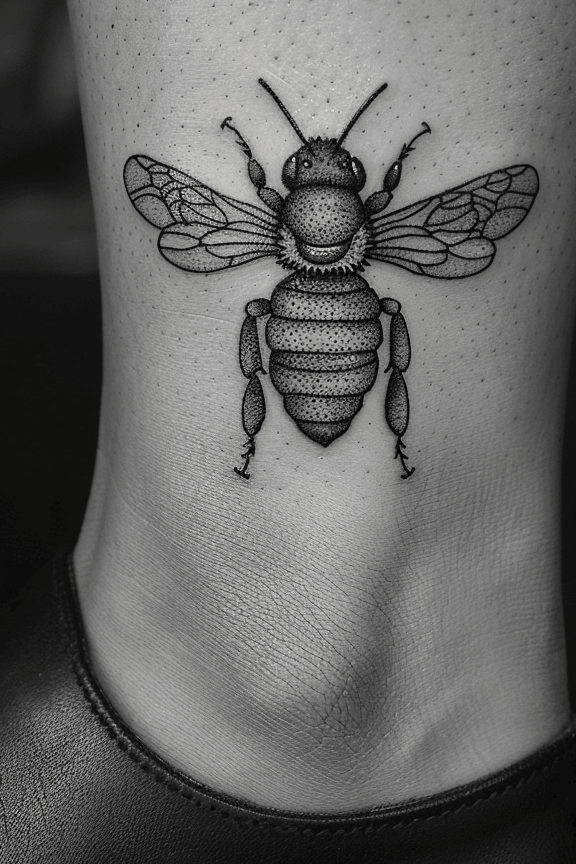 I think this tattoo stands out due to its detailed and refined artistry. The dotwork technique adds depth and texture, making the bee appear almost lifelike. It s a perfect choice for those who appreciate meticulous design and a unique, understated tattoo on their ankle.