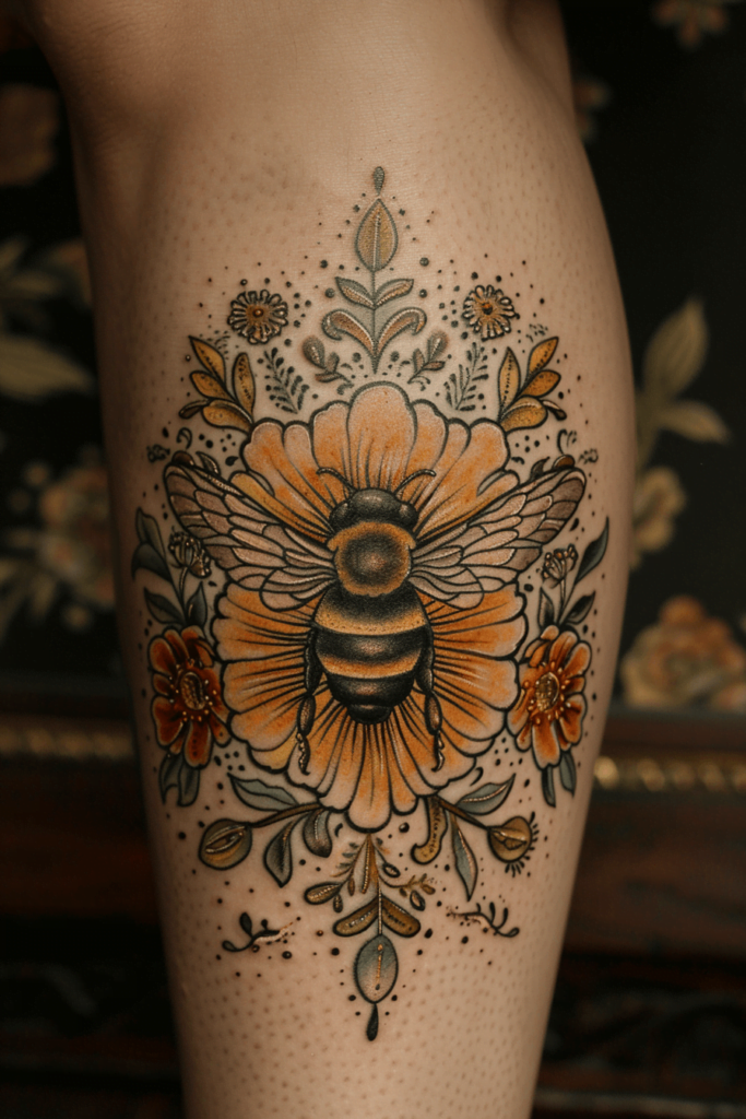 This honey bee tattoo, placed on the leg, integrates the bee with vibrant floral elements. The bee is the focal point, surrounded by orange flowers and green leaves. The design is rich in color, with meticulous details in the flowers and leaves that add depth and complexity.