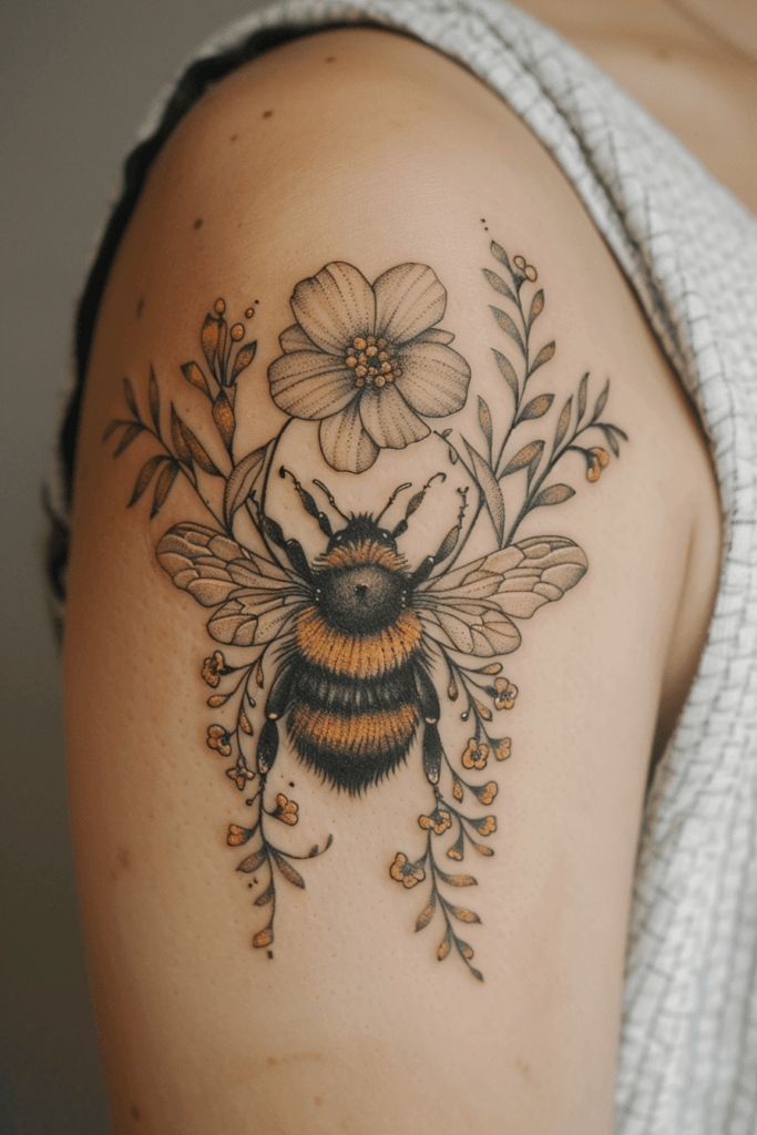 I think this tattoo is both elegant and vibrant. The shoulder placement allows for a graceful display of the artwork, and the combination of the bee with flowers creates a harmonious and balanced piece. It s perfect for someone who loves detailed, nature-inspired tattoos that stand out.