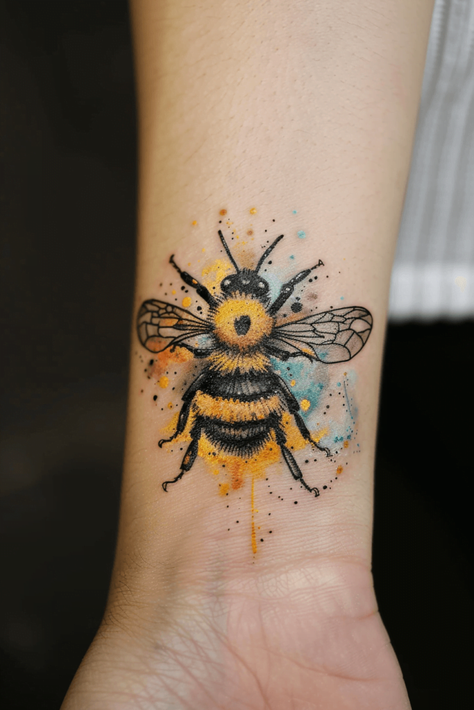 I love how this tattoo combines realism with artistic flair. The watercolor effect adds a whimsical touch to the bee, symbolizing nature s beauty and fragility. It s a cool choice for those who appreciate both detailed art and a splash of color in their tattoos.
