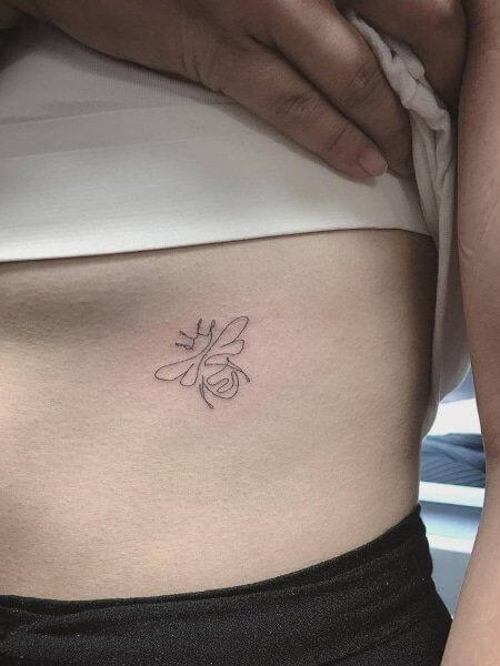 This minimalist honey bee tattoo is located on the ribcage. The design features simple, clean lines forming the shape of a bee. The tattoo is small and delicate, emphasizing the beauty of minimalism.
