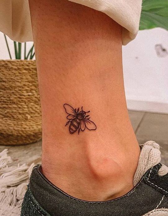 This small honey bee tattoo is placed on the ankle. The design is simple yet detailed, with fine lines creating the bee s body and wings. The tattoo s size makes it subtle but noticeable.