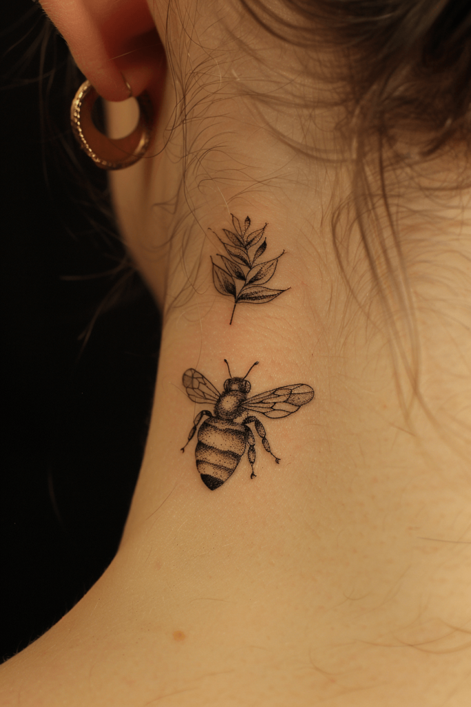 This honey bee tattoo is delicately placed on the neck, featuring a small bee paired with a simple leaf design above it. The bee is crafted with fine lines and dot shading, giving it a subtle yet detailed look. The leaf adds a touch of nature, complementing the bee s design.